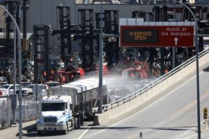 A truck passes idle container forklifts after striking Pacific coast dock workers with the International Longshore and Warehouse Union (ILWU) issued a new 72-hour notice of a walkout in Vancouver, British Columbia, Canada, July 19, 2023. REUTERS/Chris Helgren