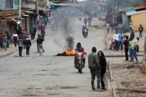 FILE PHOTO: A person rides a bike past tyres set on fire by protestors in Kibera slum during an anti-government protest against the imposition of tax hikes by the government in Nairobi, Kenya July 19, 2023. REUTERS/Monicah Mwangi/File Photo