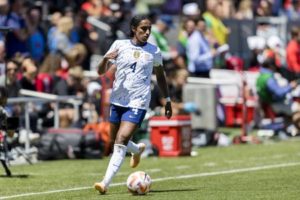 FILE PHOTO: Jul 9, 2023; San Jose, California, USA; United States of America defender Naomi Girma (4) looks to pass against Wales during the second half at PayPal Park. Mandatory Credit: John Hefti-USA TODAY Sports/File Photo
