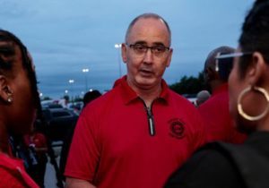 United Auto Workers President Shawn Fain greets workers at the Stellantis Sterling Heights Assembly Plant, to mark the beginning of contract negotiations in Sterling Heights, Michigan, U.S. July 12, 2023. REUTERS/Rebecca Cook