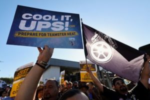 People hold placards during a rally held by teamsters employed by UPS in downtown L.A., as an August 1st strike deadline against the company nears in Los Angeles, California, U.S. July 19, 2023. REUTERS/Mike Blake
