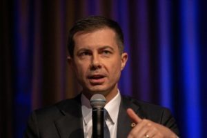 FILE PHOTO: U.S. Transportation Secretary Pete Buttigieg speaks during the National Action Network National Convention in New York, U.S., April 12, 2023. REUTERS/Jeenah Moon/File Photo