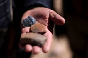 Cristian Espindola, Atacama Indigenous council member, shows archeological pieces taken from the hillside of a rock formation known as La Catedral of the Tara salt flat, in Los Flamencos National Reserve, in Antofagasta region, Chile, May 5, 2023. REUTERS/Ivan Alvarado