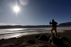 Reuters journalist Alexander Villegas walks the area of Pujsa salt flat at Los Flamencos National Reserve, in Antofagasta region, Chile, May 5, 2023. REUTERS/Ivan Alvarado