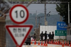 FILE PHOTO: Soldiers stand guard at a checkpoint on the Grand Unification Bridge which leads to the inter-Korean Kaesong Industrial Complex in North Korea, just south of the demilitarized zone separating the two Koreas, in Paju, South Korea, June 17, 2020. REUTERS/Kim Hong-Ji