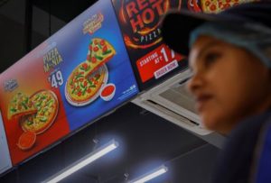 A Domino’s staff member stands next to a sign for a 49-rupee pizza at a restaurant in Noida, India, July 4, 2023. REUTERS/Adnan Abidi