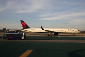 FILE PHOTO: A Delta plane passes a Delta bus on