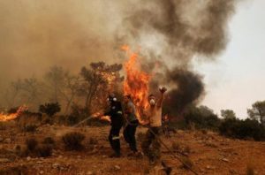 Men help a firefighter as they try to extinguish a wildfire burning near the village Vlyhada, near Athens, Greece, July 19, 2023. REUTERS/Stelios Misinas