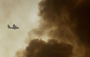 A plane flies near smoke, rising from wildfire near the village of Agios Sotira, west of Athens, Greece, July 20, 2023. REUTERS/Fedja Grulovic