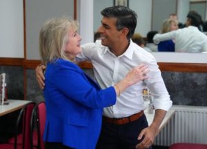 UXBRIDGE, ENGLAND – JULY 21: Prime Minister Rishi Sunak is greeted by London mayoral candidate Susan Hall as he visits Uxbridge to congratulate Conservative Party candidate, Steve Tuckwell, after he won the Uxbridge and South Ruislip by-election, on July 21, 2023 in Uxbridge, Britain. Carl Court/Pool via REUTERS