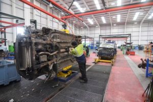 A worker at the vehicle dismantler company Charles Trent Ltd unbolts an engine from an old vehicle for reuse or recycling, on a disassembly line in Poole, Britain, June 7, 2023. REUTERS/Nick Carey