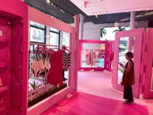 Shoppers browse Barbie-themed merchandise during the Barbie pop-up in Zara’s