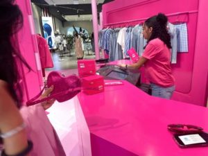 A shopper holds a pink Barbie-themed purse while a shop assistant works during the Barbie pop-up in Zara’s Soho store in New York City, U.S. July 20, 2023. REUTERS/Arriana McLymore