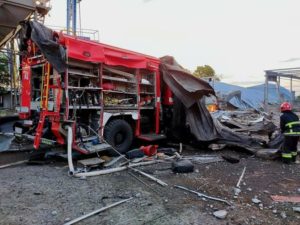 A rescue worker stands next to a heavily damaged emergency vehicle at a compound of an agricultural company hit by a Russian missile strike, amid Russia’s attack, on Ukraine in Odesa region, Ukraine July 21, 2023. Press service of the State Emergency Service of Ukraine/Handout via REUTERS