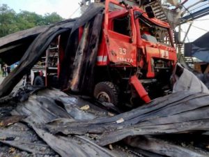 A heavily damaged emergency vehicle is seen at a compound of an agricultural company hit by a Russian missile strike, amid Russia’s attack on Ukraine, in Odesa region, Ukraine July 21, 2023. Press service of the State Emergency Service of Ukraine/Handout via REUTERS