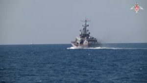 A still image from a video, released by Russia’s Defence Ministry, shows what it said to be the guided missile ship Ivanovets during drills in the Black Sea, in this image taken from video released July 21, 2023. Russian Defence Ministry/Handout via REUTERS
