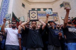 Lebanese Muslims hold copies of the Koran as they stand in front of a mosque, in a demonstration called by the Shi’ite group Hezbollah to condemn what its leader called the desecration of the Koran in Sweden by anti-Islam protesters the previous day, in Beirut’s southern suburbs, Lebanon July 21, 2023. REUTERS/Emilie Madi