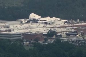 The roof of a Pfizer facility shows heavy damage after a tornado passed the area in Rocky Mount, North Carolina, U.S. July 19, 2023. ABC Affiliate WTVD via REUTERS