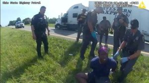 Truck driver Jadarrius Rose, 23 is taken into custody by Ohio State Highway Patrol (OSHP) officers after being attacked by a police dog during a traffic stop south of Columbus, Ohio, U.S. July 4, 2023 in a still image from police body camera video. Ohio State Highway Patrol/Handout via REUTERS