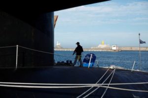 FILE PHOTO: A crew patrols on the deck of U.S. Ballistic Missile Submarine USS Kentucky anchored at Busan Naval Base, in Busan, South Korea, July 19, 2023. WOOHAE CHO/Pool via REUTERS