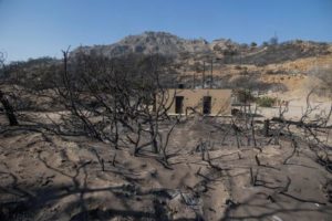 Charred trees are seen next to the beach of Glystra, as a wildfire burns on the island of Rhodes, Greece, July 24, 2023. REUTERS/Nicolas Economou