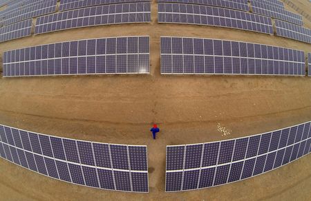 FILE PHOTO: A worker inspects solar panels at a solar farm in Dunhuang
