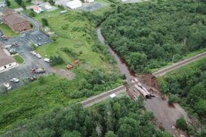 Water flows through a washed-out culvert on the main CN Rail line which leads to the port of Halifax, after the heaviest rain to hit the Atlantic Canadian province of Nova Scotia in more than 50 years triggered floods, in Truro, Nova Scotia, Canada July 23, 2023. Nigel Gloade/Millbrook First Nations/Handout via REUTERS
