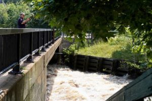 A police officer checks the water level after the heaviest rain to hit the Atlantic Canadian province of Nova Scotia in more than 50 years triggered floods, in the Halifax suburb of Bedford, Nova Scotia, Canada July 23, 2023. REUTERS/John Morris