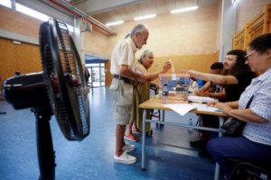 A fan is placed to cool off as people cast their votes during a general snap election at a polling station in Barcelona, Spain, July 23, 2023. REUTERS/Albert Gea/File Photo