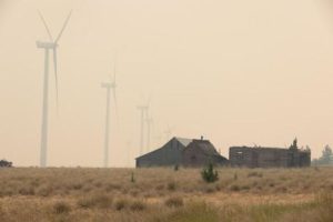A barn and wind turbines are seen amid wildfire smoke in Klickitat County, Washington, U.S., July 23, 2023. REUTERS/Matt Mills McKnight