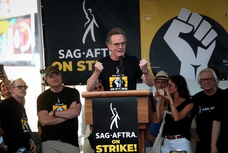 NEW YORK (Reuters) – Emmy-winning “Breaking Bad” actor Bryan Cranston rallied a crowd of striking Hollywood actors on Tuesday with comments directed at Walt Disney Co Chief Executive Bob Iger.