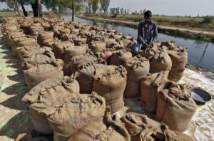 A worker packs a sack filled with rice on the outskirts of the western Indian city of Ahmedabad February 27, 2015. REUTERS/Amit Dave/File Photo