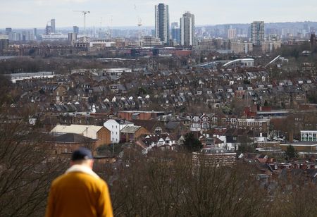 Rows of houses lie in front of the Canary Wharf skyline in London