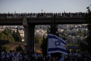 Protesters stand on a bridge at a demonstration following a parliament vote on a contested bill that limits Supreme Court powers to void some government decisions, in Jerusalem, July 24, 2023. REUTERS/Ronen Zvulun
