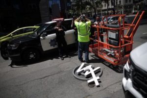 Police officers talk to a worker while the dismantling of the Twitter’s sign was stopped for a few moments, outside Twitter’s corporate headquarters building as Elon Musk renamed Twitter as X and unveiled a new logo, in downtown San Francisco, California, U.S., July 24, 2023. REUTERS/Carlos Barria