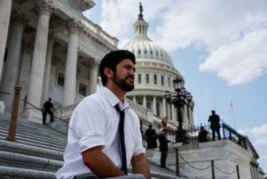 U.S. Rep. Greg Casar (D-TX) is seen on the steps of the U.S. Capitol during the sixth hour of a thirst strike to protest a new Texas state law signed by Republican Texas Governor Greg Abbott blocking local ordinances that mandate water breaks for workers, on Capitol Hill in Washington, U.S., July 25, 2023. REUTERS/Jonathan Ernst