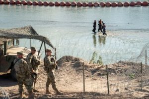Asylum-seeking migrants walk in the Rio Grande river between floating fence and the river bank as they look for an opening on concertina wire fence to lad on the U.S. soil in Eagle Pass, Texas, U.S. July 24, 2023. REUTERS/Go Nakamura