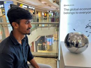Kaleem, 22, an engineer in Bengaluru, signs up for WorldCoin by having his eyes scanned by the spherical device in Mantri Square Mall in Bengaluru, India July 25, 2023. REUTERS/Medha Singh – RC27A2A50XBO
