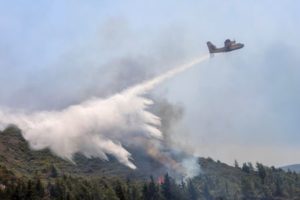 A firefighting plane makes a water drop as a wildfire burns near the village of Vati, on the island of Rhodes, Greece, July 25, 2023. REUTERS/Nicolas Economou