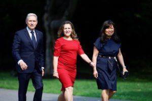 Canada’s Minister of Innovation, Science and Industry Francois-Philippe Champagne, Deputy Prime Minister and Minister of Finance Chrystia Freeland and Minister of International Trade, Export Promotion, Small Business and Economic Development Mary Ng arrive ahead of a cabinet shuffle at Rideau Hall, in Ottawa, Ontario, Canada, July 26, 2023. REUTERS/Blair Gable