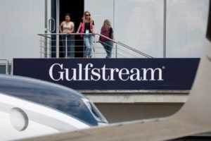 FILE PHOTO: People stand near a Gulfstream Aerospace logo at the 54th International Paris Airshow at Le Bourget Airport near Paris, France, June 18, 2023. REUTERS/Benoit Tessier/File Photo