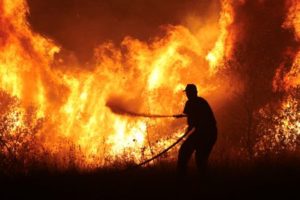 A firefighter tries to extinguish a wildfire burning at the industrial zone of the city of Volos, in central Greece, July 26, 2023. REUTERS/Alexandros Avramidis