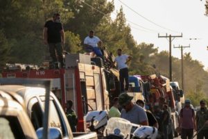 Firefighters and volunteers are seen next to vehicles as a wildfire burns in the village of Vati, on the island of Rhodes, Greece, July 26, 2023. REUTERS/Nicolas Economou