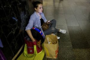 A woman takes cover inside a subway station with her dog during an air raid alert, amid Russia’s attack on Ukraine, in Kyiv, Ukraine, July 26, 2023. REUTERS/Alina Smutko