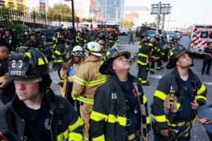 Firefighters gather after a construction crane caught fire on a high-rise building in Manhattan, New York City, U.S., July 26, 2023. REUTERS/Amr Alfiky