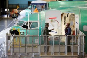 FILE PHOTO: Workers are pictured next to Boeing’s 737 MAX-9 under construction at their production facility in Renton, Washington, U.S., February 13, 2017. Picture taken February 13, 2017. REUTERS/Jason Redmond/File Photo