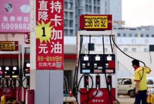 FILE PHOTO: A pump attendant is seen next to a discount advertisement for gasolines at a Petrochina petrol station in Shenyang, Liaoning province, China June 24, 2019. REUTERS/Stringer/File Photo