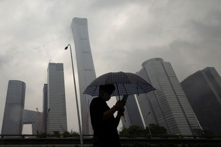 FILE PHOTO: A man walks in the Central Business District on a rainy day, in Beijing