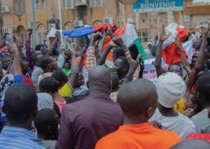 Hundreds of supporters of the coup gather and hold a Russian an Niger flags in front of the National Assembly in the capital Niamey, Niger July 27, 2023. REUTERS/Souleymane Ag Anara
