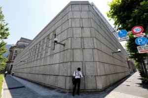 FILE PHOTO-A man looks at a mobile phone in front of the Bank of Japan building in Tokyo, Japan June 16, 2017. REUTERS/Toru Hanai/File Photo